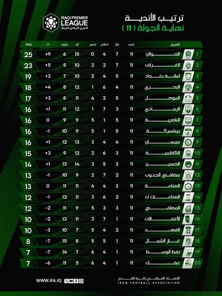 ترتيب فرق الدوري الممتاز بنهاية الجولة 11 20 يناير، 2025 الرياضيةمقالات مشابهة رئيس الأولمبية يؤكد تحييد الرياضة عن السياسة20 ديسمبر، 2025 إشادات رسمية بتأهل المنتخب الوطني إلى الملحق العالمي18 نوفمبر، 2025 منتخبنا الوطني يلاقي نظيره الإماراتي على ملعب البصرة الدولي في إياب الملحق الآسيوي18 نوفمبر، 2025 شاركها Facebook Twitter Stumbleupon LinkedIn Pinterest