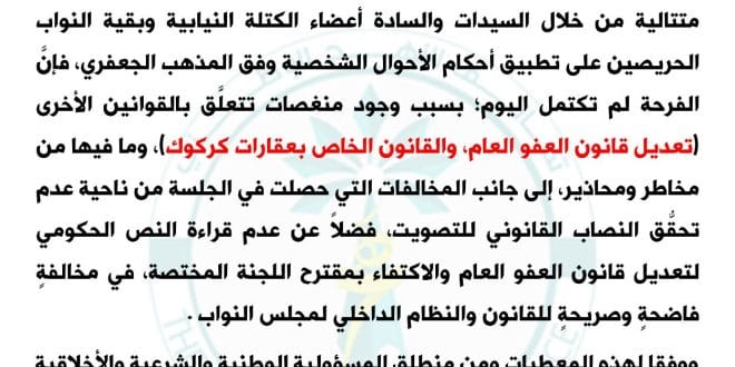 وأشارت الكتلة، في بيان لها، إلى أن جلسة التصويت على تعديل قانون الأحوال الشخصية، إلى جانب تعديل قانون العفو العام والقانون الخاص بعقارات كركوك، شابتها خروقات أبرزها عدم تحقق النصاب القانوني، وعدم قراءة النص الحكومي لتعديل قانون العفو العام، والاكتفاء بمقترح اللجنة المختصة، وهو ما اعتبرته مخالفة واضحة للنظام الداخلي لمجلس النواب.