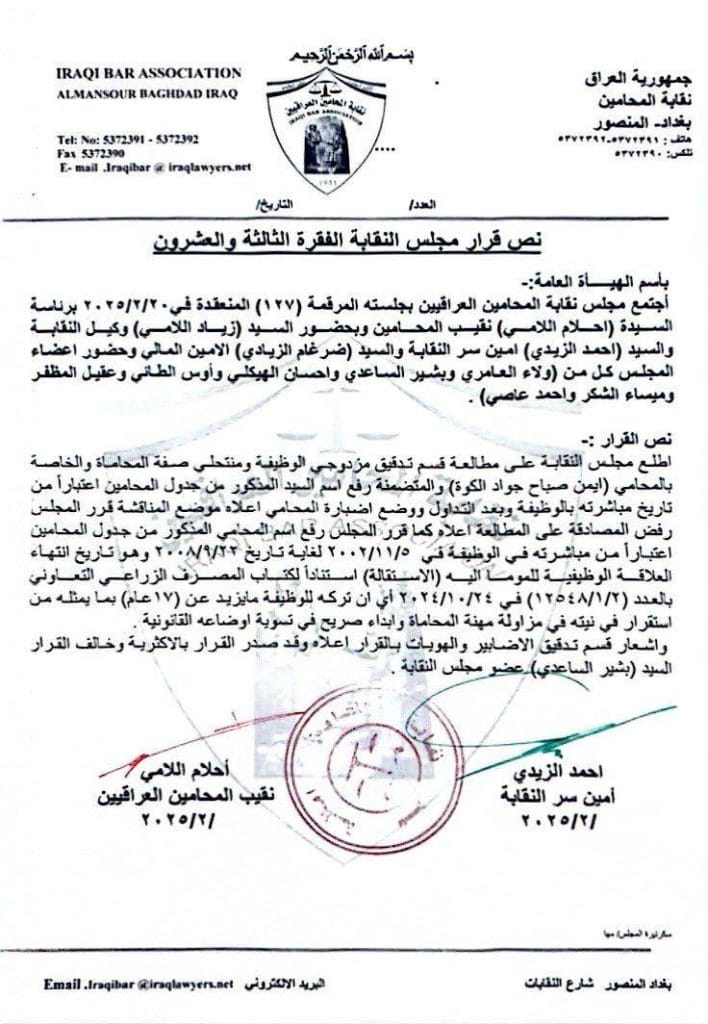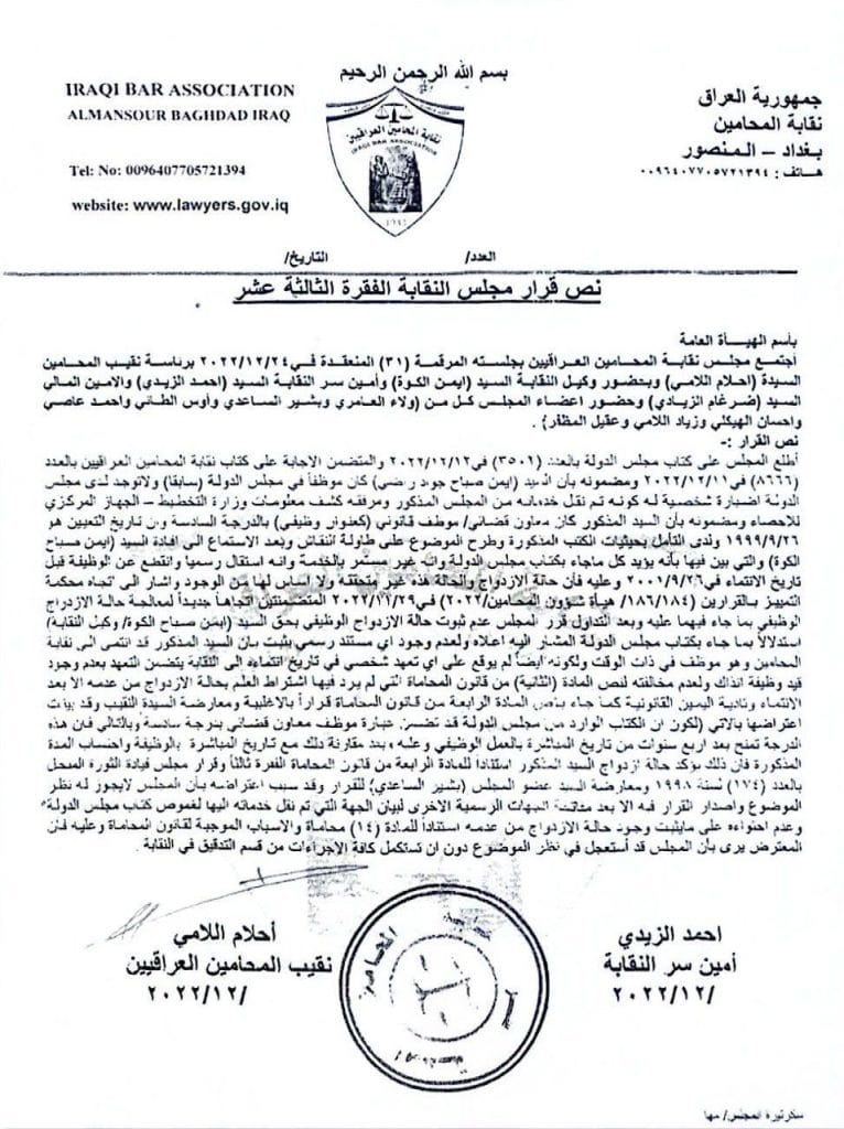 وفي سياق متصل، كانت نقابة المحامين قد اجتمعت في 24 ديسمبر 2022 بجلستها المرقمة (31) للنظر في ملف المحامي ذاته، حيث استعرضت كتاب مجلس الدولة المؤكد لانفصاله عن الوظيفة قبل تاريخ انتمائه إلى النقابة، مما ينفي عنه حالة الازدواج الوظيفي. وعلى إثر ذلك، قرر المجلس بالأغلبية عدم ثبوت الازدواج الوظيفي بحقه، مع معارضة النقيب السيدة أحلام اللامي وعضو المجلس بشير الساعدي، اللذين طالبا بمزيد من التحقق من الجهات الرسمية.