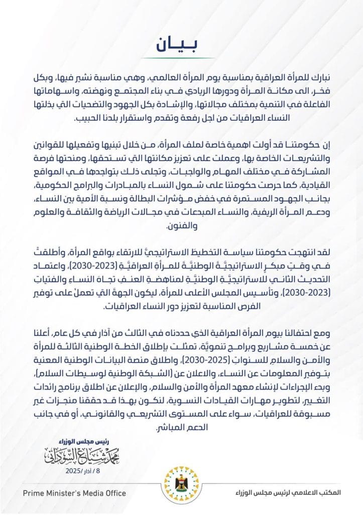 رئيس الوزراء: ستكون هنالك استراتيجيات جديدة لتعزيز حقوق المرأة 8 مارس، 2025 السياسية, عاجلمقالات مشابهة الإعمار والتنمية النيابية تؤكد دعمها للإجراءات الحكومية وتدعو للابتعاد عن الفتنة الإعلامية7 مارس، 2026 كتلة الإعمار والتنمية تقيم مجلس عزاء وتدعو إلى توحيد الصف4 مارس، 2026 مصدر يكشف موافقة المالكي على سحب ترشيحه لرئاسة الوزراء3 مارس، 2026 شاركها Facebook Twitter Stumbleupon LinkedIn Pinterest