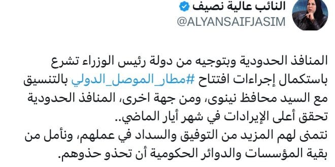قالت النائب عالية نصيف، إن هيئة المنافذ الحدودية، وبتوجيه مباشر من رئيس مجلس الوزراء، شرعت في استكمال التحضيرات لافتتاح مطار الموصل الدولي بالتنسيق مع محافظ نينوى.