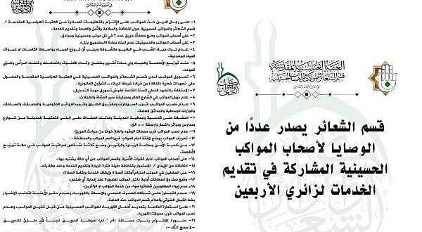 أصدر قسم الشعائر والمواكب والهيآت الحسينية في العتبة العباسية، مجموعة من الوصايا لتنظيم عمل المواكب الخدمية خلال زيارة الأربعين المقبلة.