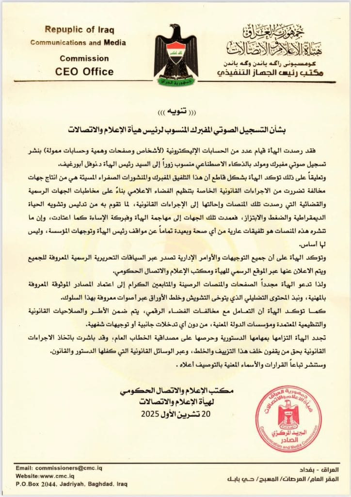 نفت هيأة الإعلام والاتصالات صحة التسجيل الصوتي المنسوب إلى رئيسها نوفل أبورغيف، مؤكدة أنه مفبرك ومولّد بتقنيات الذكاء الاصطناعي من قبل حسابات وهمية وممولة.