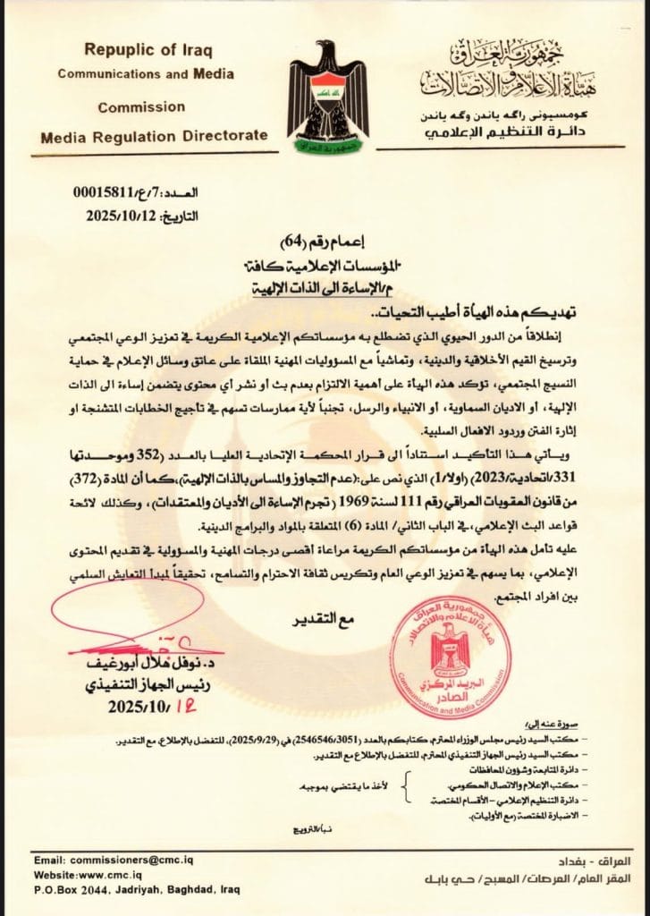وذكرت الهيئة في بيان تلقته نقطة للأخبار، أن هذا التوجيه يأتي استناداً إلى قرار المحكمة الاتحادية العليا بالعدد (352) وموحدتها (331/اتحادية/2023)، وإلى المادة (372) من قانون العقوبات العراقي رقم (111) لسنة 1969، فضلاً عن لائحة قواعد البث الإعلامي التي تمنع المساس بالقيم الدينية.